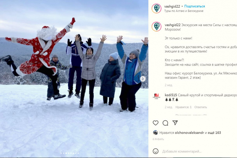 28 января запланирована очередная трансляция в инстаграм-аккаунте Туристского центра Алтайского края. На эфир с подписчиками visitaltai.info приглашена Анна Редина – менеджер по продажам курортного агентства «Ваш гид». Услугами этого туроператора проще всего воспользоваться отдыхающим в Белокурихе, где базируется офис компании. Встреча с ответами на вопросы слушателей эфира начнется в пятницу 28 января в 17.00.