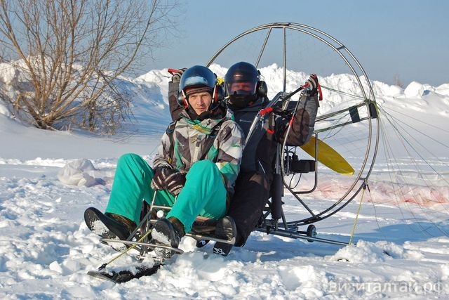 В окрестностях краевой столицы или с выездом в Смоленский район туристов готова «ставить на крыло» барнаульская Школа приключений «Зов ветра». Конструкция мотопараплана, на котором выполняются прогулочные полеты в тандеме с инструктором, зимой имеет преимущество перед безмоторными летательными аппаратами. Скажем, взлету параплана может помешать крайне неустойчивая из-за частых снегопадов и метелей погода (а полеты под куполом – очень метеозависимый вид досуга).. На земле – одни метеоусловия, а на горе могут быть совсем другие, нелетные, объясняет инструктор парапланерного клуба «Крылья Алтая» Константин Земеров. У мотопарапланов же – собственная тяга, взбираться на вершину для вылета не нужно, поэтому зимой их пилоты чувствуют себя более независимо. И соглашаются катать туристов – хоть в окрестностях Барнаула, хоть отдыхающих в Белокурихе: по договоренности.