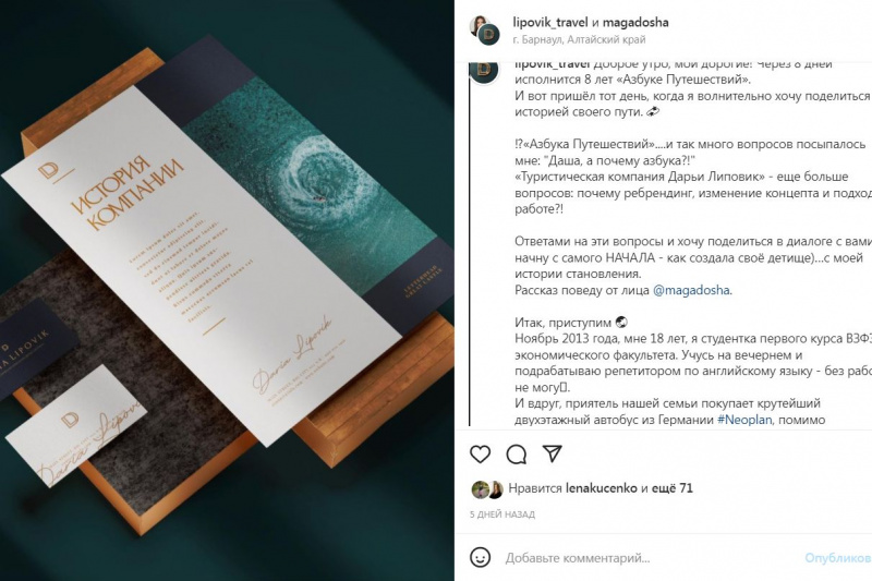 За пару дней до 8-летия туроператора «Азбука путешествий» в прямой эфир выйдет его руководитель. Пережив ребрендинг, туркомпания теперь носит имя своей основательницы Дарьи Липовик – эксперта по детскому и зарубежному отдыху, организатора VIP-туров по Алтаю. Вместе с названием Daria Lipovik Tour Company меняет концепт, подходы к работе и предлагает нестандартые маршруты. Новинки готовятся презентовать в ближайшие дни на московских выставках «Интурмаркет» и MITT. Но еще прежде о новшествах услышат гости прямого эфира в аккаунте Туристского центра Алтайского края. 11 марта их собеседницей станет Дарья Липовик.