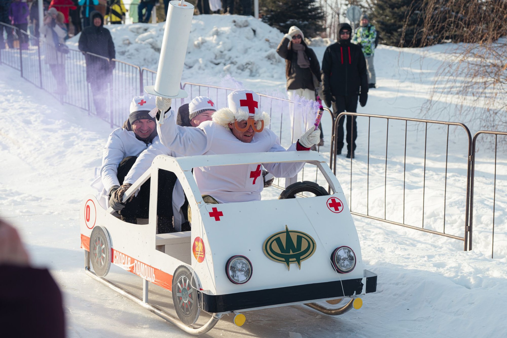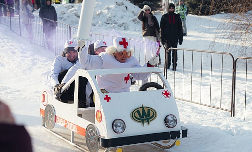 В спусках на санях с масленичной горы участвовали семь команд. Дальше всех – на 80 метров – улетела «ракета» с космонавтами из сети санаториев «Курорт Белокуриха». Они же стали победителями среди «корпоративных» саней. Карета скорой помощи с «Айболитами» санатория «Алтай West» заняла второе место в этой номинации, Иткульский спиртзавод также вошел в призовую тройку. Команду банного чана на полозьях с дымившейся трубой от усадьбы «Золото Алтая» жюри отметило призом за самую оригинальную визитку. Сани-бульдозер команды «Созидание» заслужили титул «Самые креативные сани». Лучшими в номинации «Командные сани» стали «Три богатыря весной», а соперничавшие с ними «Бурундуки из Сибири» заработали не только второе место, но и специальный приз жюри.