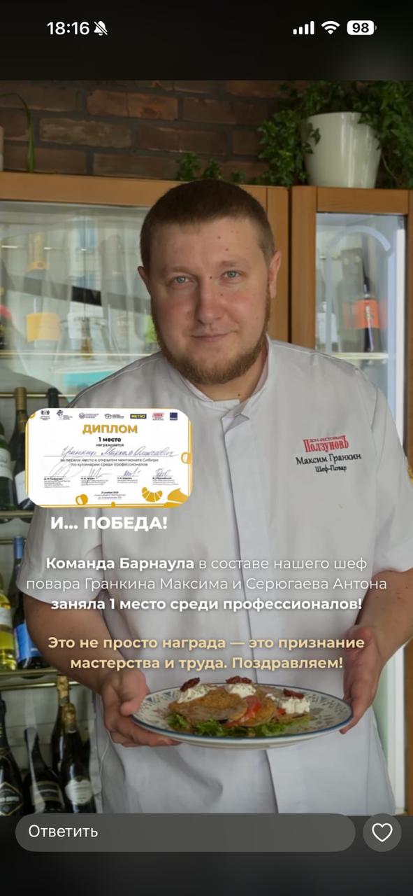 В отборочном туре команда Алтайского края за 1,5 часа приготовила из набора заранее известных продуктов «Национальный обед»: холодную закуску, горячее блюдо и десерт. А в финале решила «задачу со звездочкой»: создав горячее блюдо и десерт из продуктов, которые извлекли перед началом соревнований из «черного ящика». Сообщение о победе сборной региона в понедельник получили подписчики ресторана «Ползунов», чей шеф-повар Максим Гранкин на чемпионате по кулинарии руководил региональной командой. Вместе с ним медали чемпионата выиграли шеф-повара барнаульских заведений «Облако» Антон Серюгаев и UNO Caffè Максим Карнаушенко.Команда-победительница Чемпионата Сибири представит Алтайский край на Всероссийском кулинарном чемпионате Chef a la Russe в Москве 15-17 апреля 2026 года.