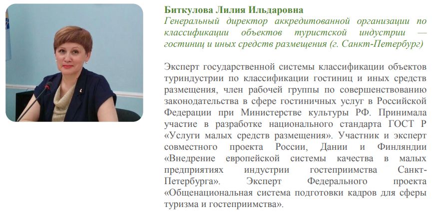 Как подготовить «зеленые дома» и сельские гостиницы к классификации по новым национальным стандартам индустрии гостеприимства? Об этом расскажет эксперт федерального уровня из Санкт-Петербурга Лилия Биткулова. Она является генеральным директором Центра классификации «Звезды Отелям», аккредитованной для классификации объектов туристской индустрии.
