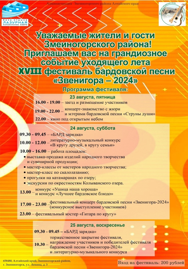 18-й раз у озера Колыванского в окружении скал соберутся исполнители и любители авторской песни. Три дня гитарные наигрыши начинающих бардов и мэтров жанра будут звучать на сцене, а по ночам – у большого костра. ,В центральный день фестиваля «Звенигора-2024» на ремесленной ярмарке станут устраивать творческие мастер-классы, а в окрестностях озера – уроки скалолазания и экскурсии. Лакомки не пропустят конкурсы на лучшую уху и «бардовское блюдо», любители кино – сеансы под открытым небом.