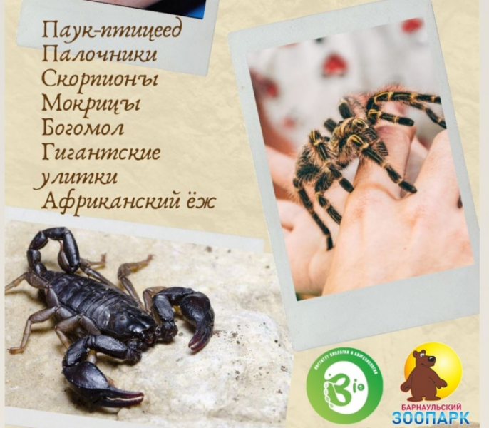 барнаульском зоопарке на выставке будут представлены: палочники, паук-птицеед, скорпионы, мокрицы, богомол, гигантские улитки, африканский ежик. Все животные ручные, с ними можно сделать фото на память. А самые большие любители смогут получить ответы на интересующие вопросы и даже приобрести питомца!