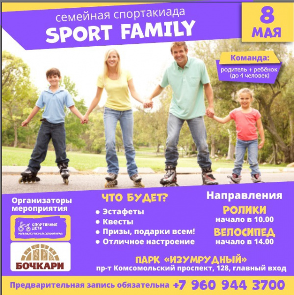 На семейную спартакиаду приглашают команды от 2 до 4 человек. Обязательное условие - участие родителя и ребенка. Вас ждут эстафеты на роликах и велосипедах, квесты, призы и подарки за участие.