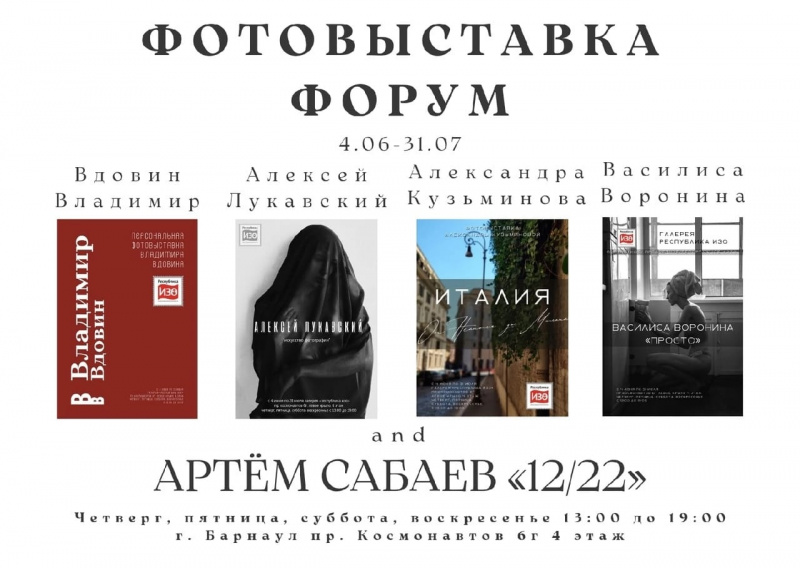 Галерея Республика «ИЗО» приглашает на открытие фотовыставки «Форум», где будут представлены персональные проекты Владимира Вдовина, Василисы Ворониной, Александры Кузьминовой, Алексея Лукавского и Артема Сабаева. Работы авторов выполнены в разнообразных стилях – репортажном, постановочно, предметном и т.д. Вас ждут фотографии Италии, панорамные снимки Барнаула, обнаженная натура и женские портреты. На открытии выступит вокально-симфонический дуэт Cabernet Duet (Сергей Лазорин, Игорь Наумов), для гостей организуют фуршет. Хэдлайнер выставки – Владимир Вдовин.